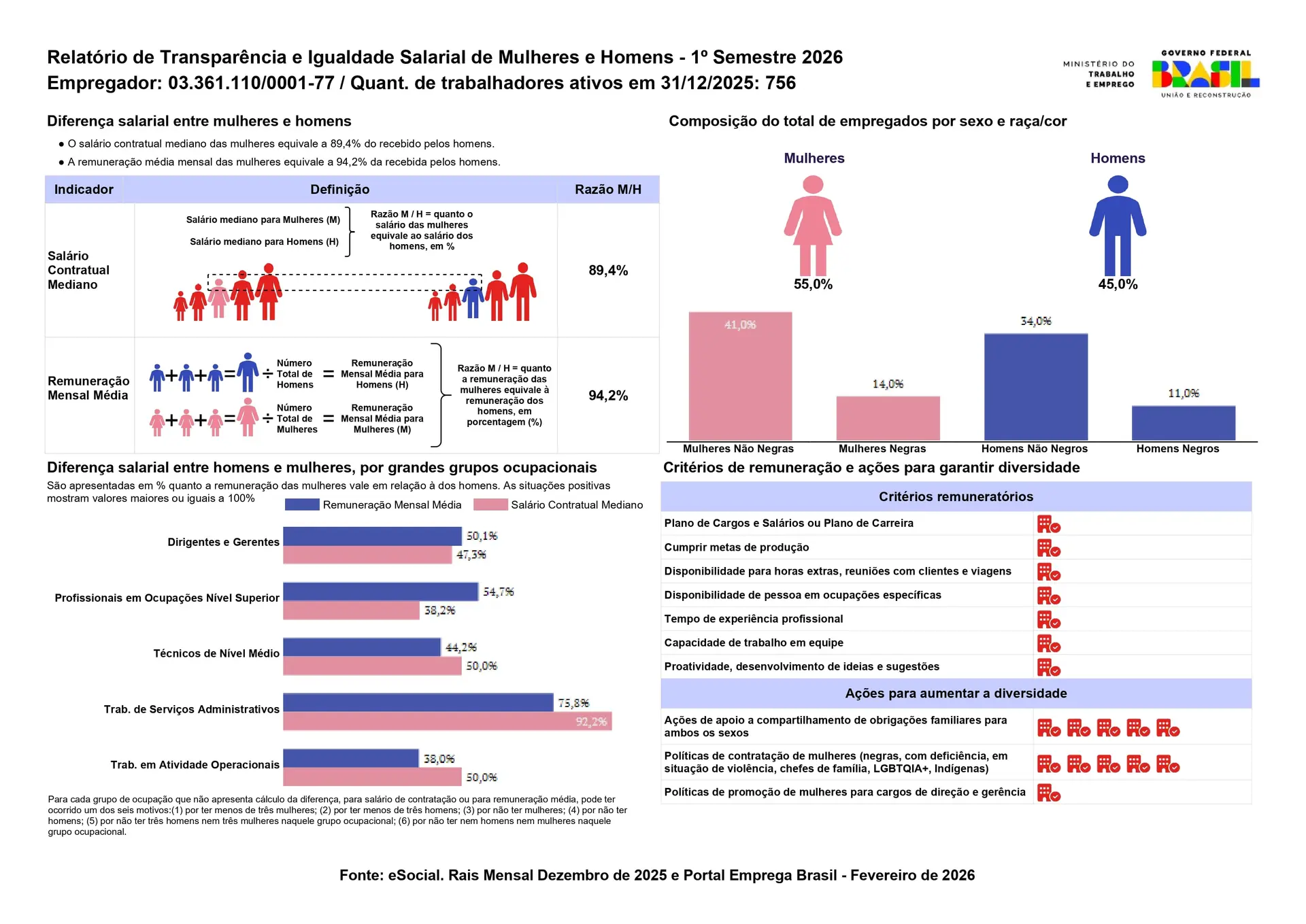 O documento apresenta informações relativas à composição do quadro de colaboradores, critérios remuneratórios adotados e indicadores de comparação salarial entre mulheres e homens, com base em dados oficiais do eSocial, RAIS e Portal Emprega Brasil.