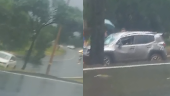 Um veículo, modelo Jeep Renegade, acabou batendo contra uma árvore e capotando na Avenida Duque de Caxias, em Campo Grande, na manhã desta quinta-feira (12). Chovia forte no momento do acidente.