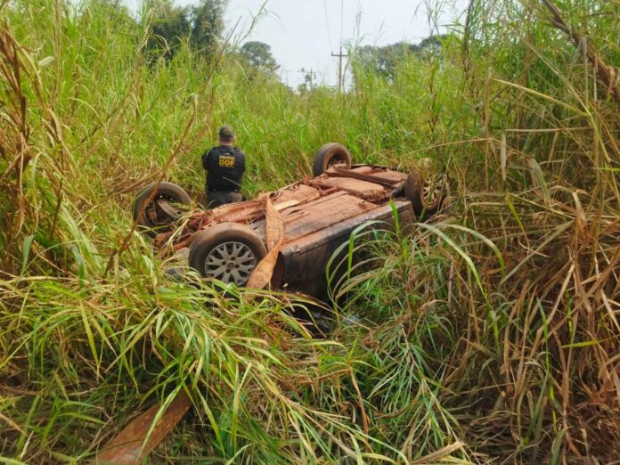 Um veículo carregado de mercadorias contrabandeadas do Paraguai acabou capotando durante perseguição envolvendo viatura do Departamento de Operações de Fronteira (DOF) em Laguna Carapã.