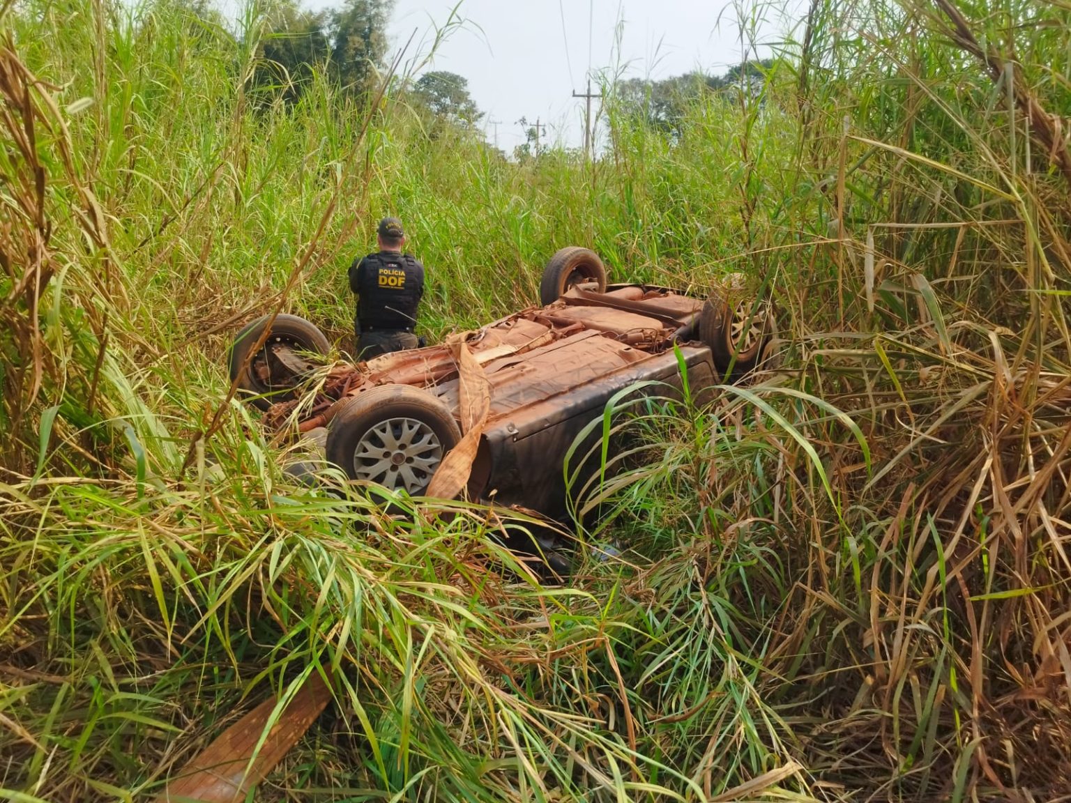 Veiculo carregado de contrabando capota na MS-380 durante perseguição