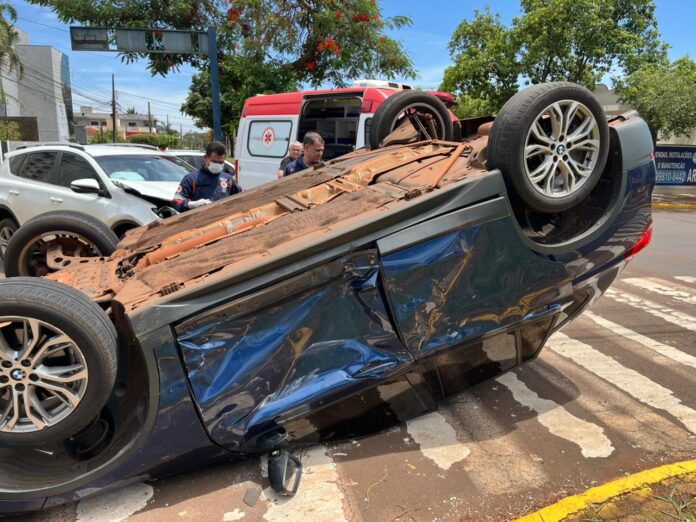 Um veículo de luxo, modelo BMW X1, acabou capotando ao se envolver em um acidente de trânsito na manhã dessa quinta-feira (27) em Dourados. Pelo menos uma pessoa precisou ser levada para o Hospital da Vida por conta dos ferimentos.
