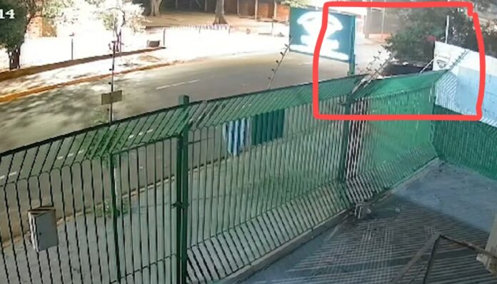 Por conta da batida, o muro ficou danificado. A dona da casa, uma idosa não identificada, colocou um portão de grade improvisada para tampar o buraco aberto pelo carro.