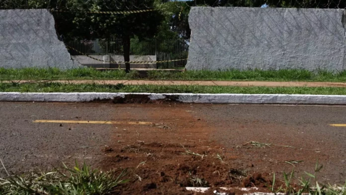 Parte do muro do entorno da Base Aérea de Campo Grande, às margens da Avenida Duque de Caxias, foi destruído na madrugada desta sexta-feira (14), após um acidente de trânsito.