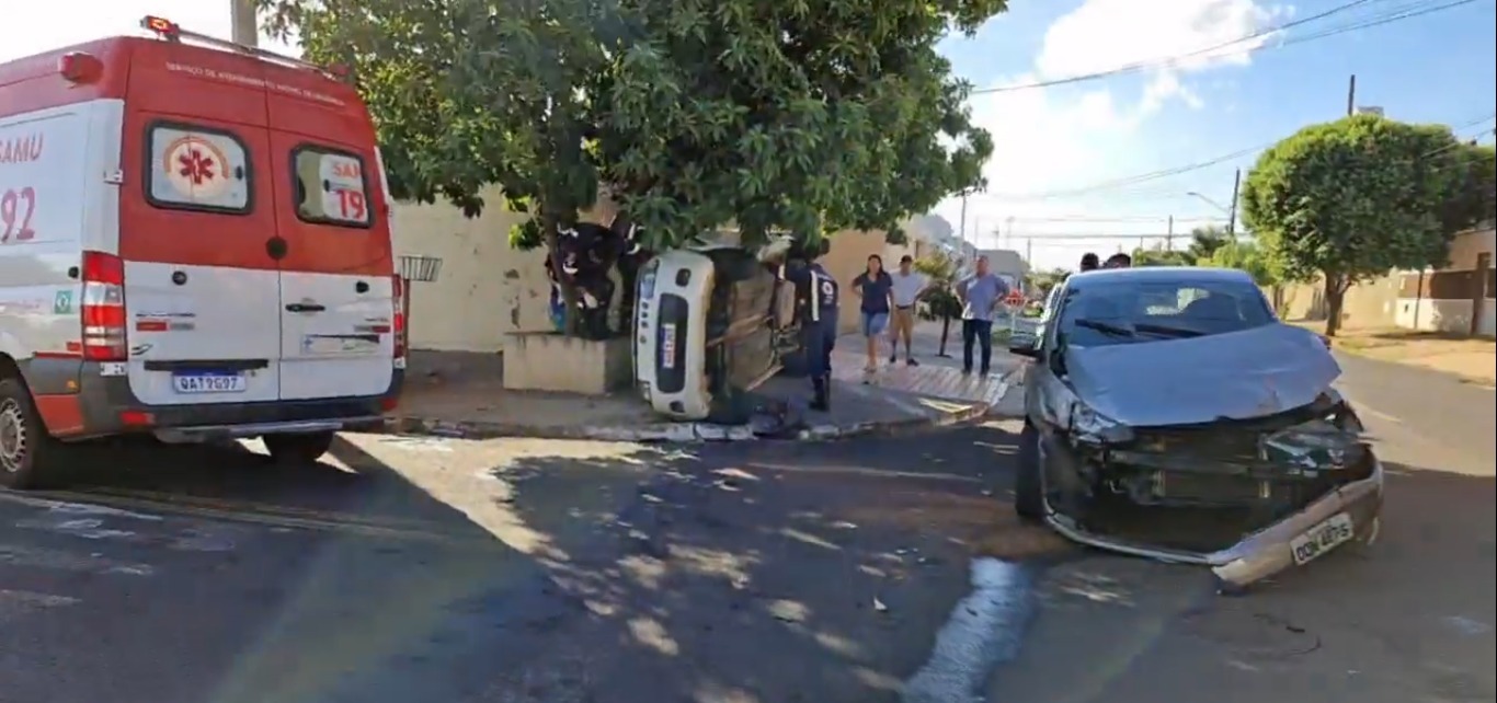 Um veículo capotou na tarde dessa sexta-feira (16), em Campo Grande, em decorrência de um acidente de trânsito. Uma das vítimas ficou presa às ferragens e a ocorrência mobilizou o Corpo de Bombeiros.