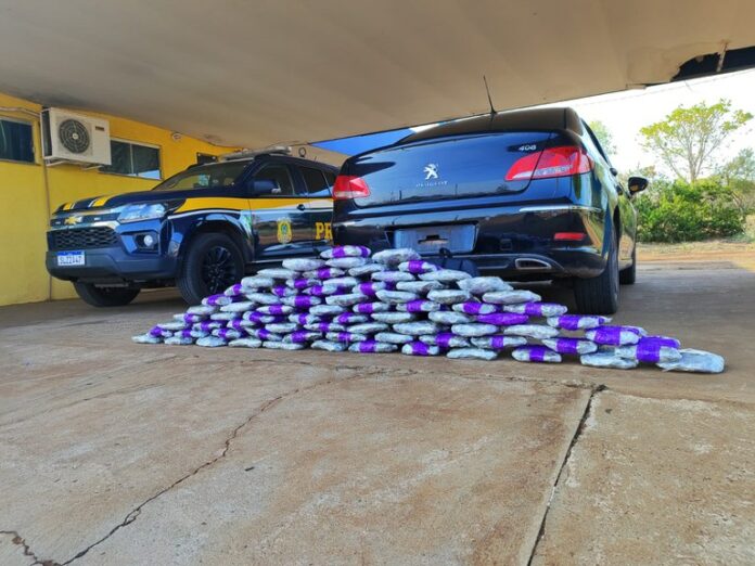 Policiais rodoviários federais apreenderam quase 40 quilos de skunk na terça-feira (17), em Agua Clara. A droga estava em um veículo, modelo Peugeot/408, que seguia pela rodovia federal BR-262.