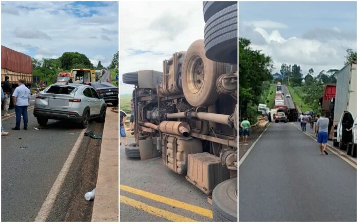 Segundo a imprensa local, dois veículos, modelos VW Virtus e Fiat Fastback, acabaram batendo em uma carreta, que tombou no meio da pista.