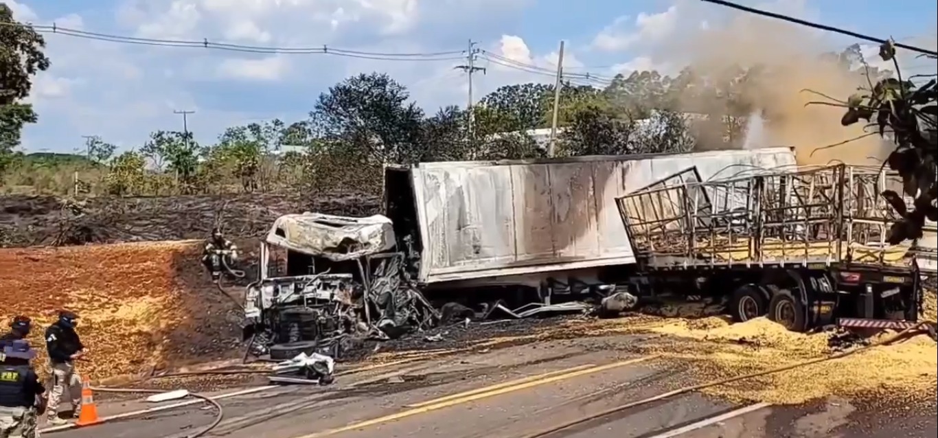 Na tentativa de evitar o acidente, a segunda carreta, que estava carregada de grão de milho, acabou batendo na caminhonete e também no caminhão com frutas. Os três pegaram fogo e ficaram completamente destruídos.