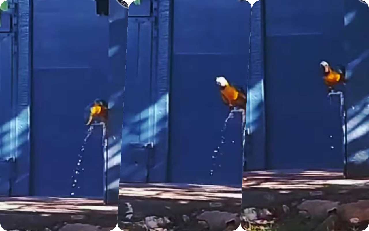 Na cena, é possível ver o pássaro pousando sobre a torneira e, com o bico, a abre para que a água possa sair e ela tomar para matar a sede e se refrescar diante do forte calor dos últimos dias. Antes de ir embora, a arara ainda fechou a torneira.