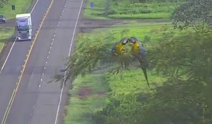 Nas imagens, elas são vistas ‘trocando bicadas’. O flagrante, que não foge do cotidiano de quem opera as câmeras de videomonitoramento da concessionária, chamou atenção, foi gravado e compartilhado.