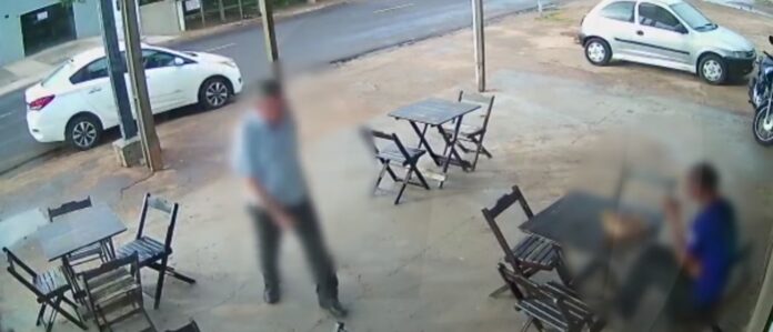 No mesmo local, um homem usando uma camiseta azul está sentado comendo salgado em uma das mesas. Este sujeito observa todos os detalhes e, disfarçadamente, se levanta e vai em direção ao veículo.