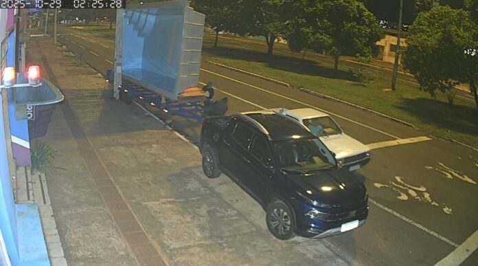 Em seguida, ele retorna junto de um comparsa, que começa a mexer no reboque. Logo, outra pick-up, modelo Saveiro, para ao lado. Os bandidos retiram a carretinha da Fiat Toro e engatam no Saveiro, fugindo. A ação durou menos de um minuto