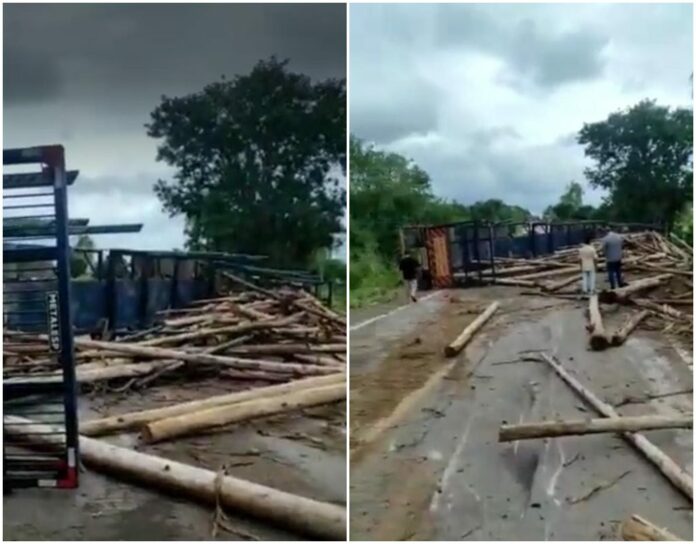 Uma carreta bitrem carregada com toras de Eucalipto tombou e esparrrou a carga no meio da pista da rodovia federal BR-267, próximo à Caracol.
