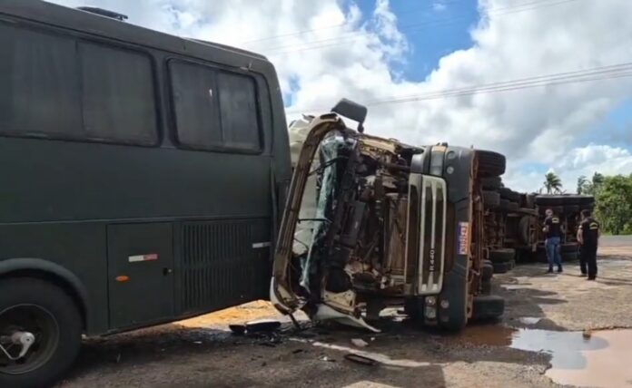 Em seguida, por conta do peso da carga e do desnível do chão, tomba, atingindo a traseira de um ônibus pertencente ao Exército Brasileiro e também a estrutura da oficina. Por sorte, apesar da imagem impressionante, o motorista da carreta conseguiu sair da cabine com a ajuda de testemunhas, mas foi levado para a Santa Casa por conta de um corte profundo na mão.