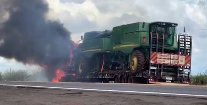 Uma carreta pegou fogo na tarde desta quinta-feira (03) na rodovia federal BR-163, em Itaquiraí. O veículo transportava duas colheitadeiras, que também foram incendiadas.