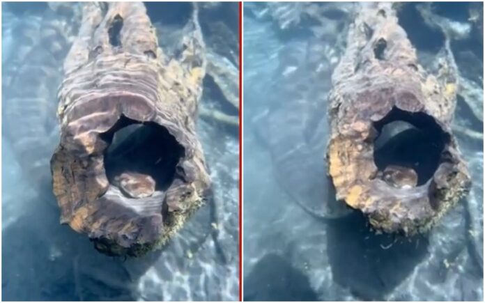A cobra, que mede cinco metros, foi vista descansando em um tronco de árvore submerso. O animal silvestre não demonstrou medo perante a máquina fotográfica do monitor ambiental Liedison Leal, de 24 anos, autor do registro.