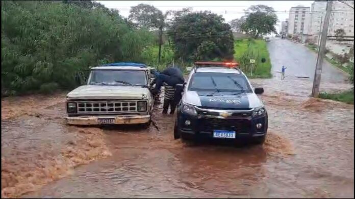 Por muito pouco não arrastou a caminhonete deles para dentro do córrego. Ao mesmo tempo, uma viatura da Polícia Militar passava pelo local e parou para ajudar. Os militares, mesmo na chuva, desceram e colocaram a viatura ao lado da caminhonete.