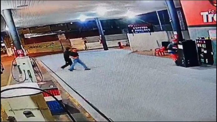 Entretanto, quando o frentista se aproxima para o atendimento acaba sendo surpreendido pelo anuncio do assalto. Os dois envolvidos rendem a vítima com uma faca e seguem até o caixa.