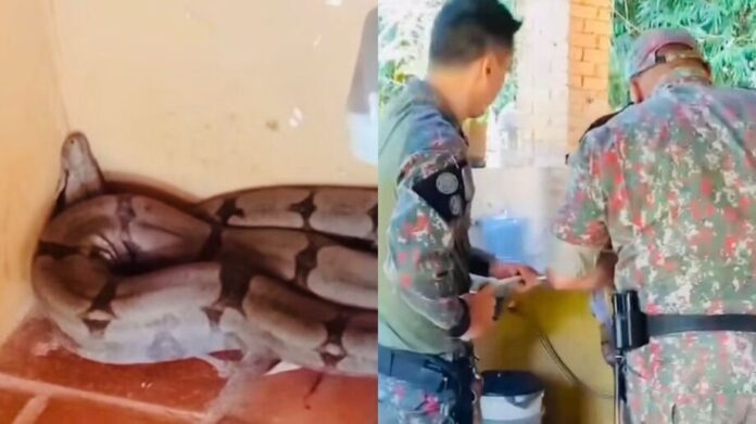 Depois da remoção, os militares fizeram a soltura da jiboia numa área distante dos imóveis daquela região.