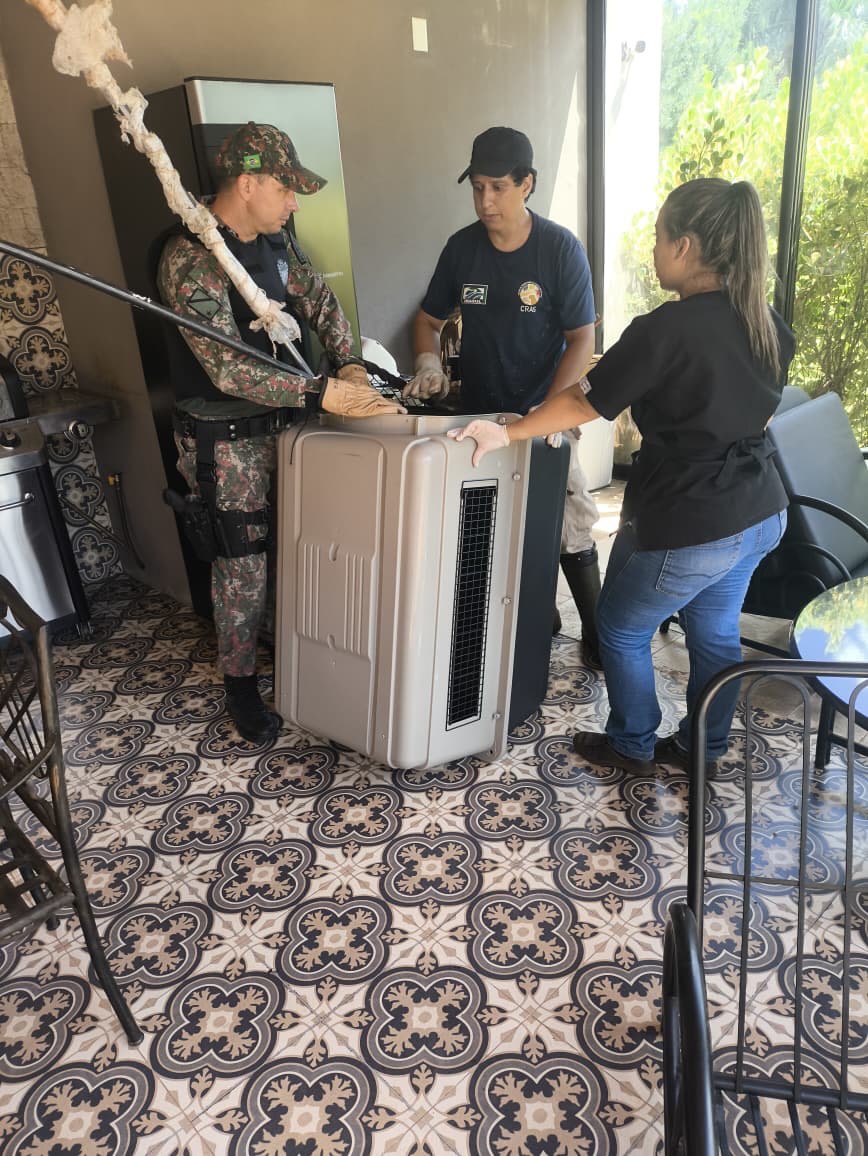 O animal silvestre já estava sendo monitorado pelos moradores de um condomínio no bairro Parque dos Poderes, região de mata nativa com a presença de várias espécies, até que invadiu o telhado de uma das casas e foi parar na cozinha.