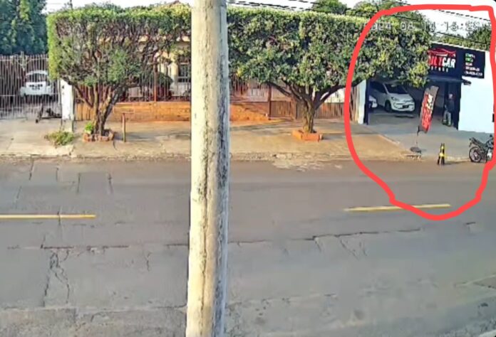Imagens de câmeras de videomonitoramento registraram o momento em que o atirador chega no local onde o crime acontecendo, uma revendedora de veículos seminovos localizada na Rua José Paes de Farias, no bairro Vila Jacy.