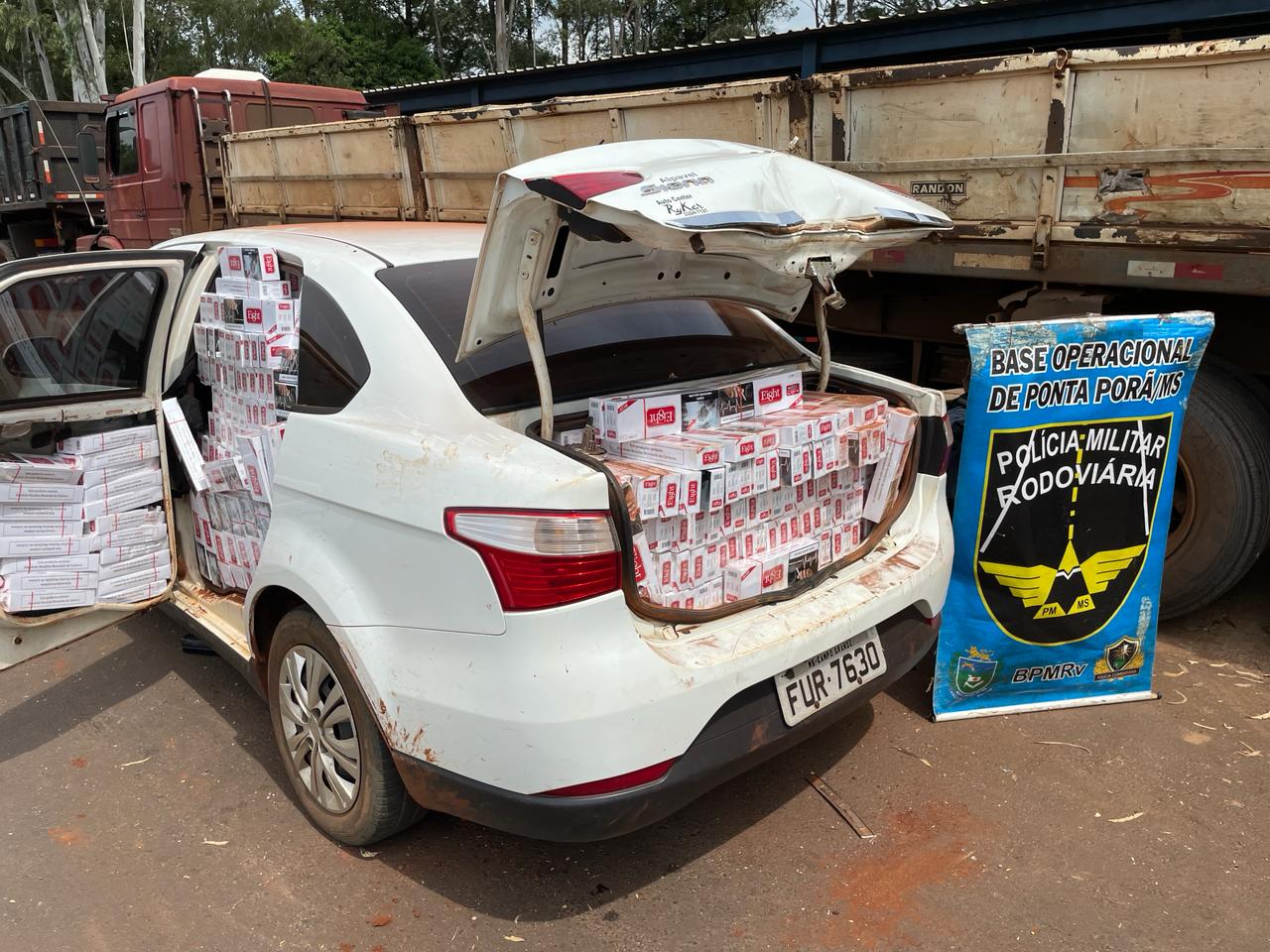 Um veículo abarrotado de cigarros contrabandeados do Paraguai foi flagrado pelo Batalhão da Polícia Militar Rodoviária (BPMRv) nessa quinta-feira (08), em Ponta Porã.
