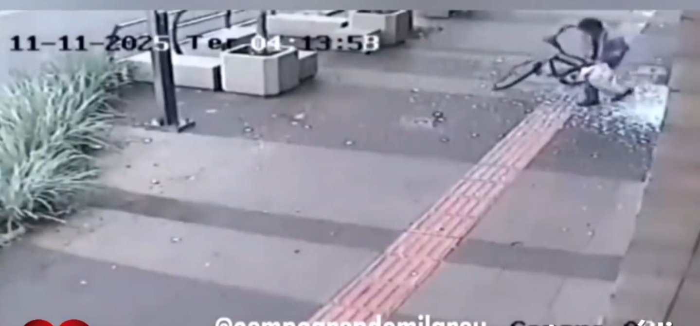 A ação durou pouco mais de um minuto. As imagens mostram o autor passando em frente a loja, na Rua 14 de Julho, de bicicleta, e carregando uma pedra.
