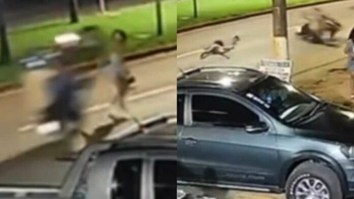 Devido à força do impacto, a vítima perdeu a consciência e caiu no meio da via, enquanto o motociclista retira a moto e foge com a ajuda de um amigo.
