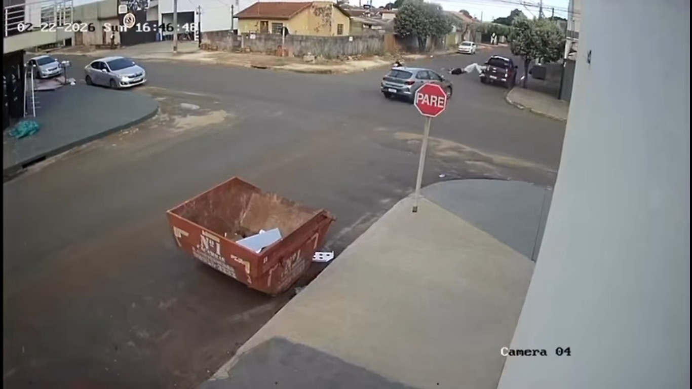 Imagens de uma câmera de videomonitoramento registraram o momento em que um motociclista, em fuga da polícia, se envolve em um grave acidente de trânsito na cidade de Nova Andradina.