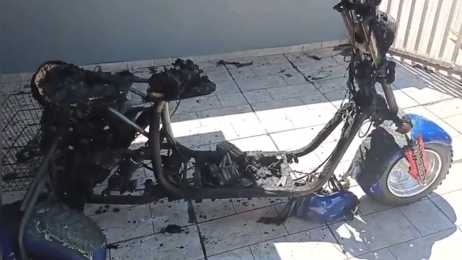 Um triciclo elétrico ficou completamente destruído na manhã desta quarta-feira (2) ao pegar fogo na garagem de um residência, em Rio Verde de Mato Grosso.