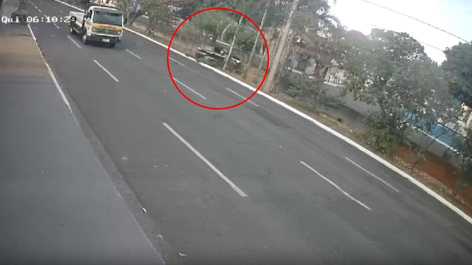 Imagens de câmeras de videomonitoramento registraram o momento em que um veículo, modelo Fiat Mobi, atravessa o canteiro, derruba uma árvore e cai dentro do Córrego Segredo, em Campo Grande.