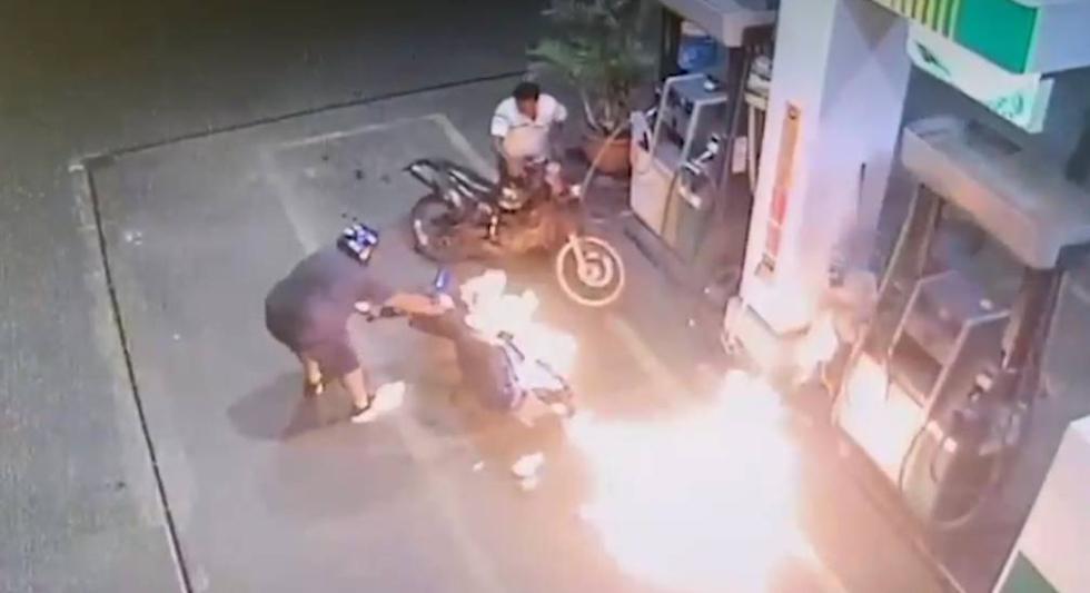 As chamas se espalharam rapidamente pela motocicleta enquanto que o motociclista responsável ainda tenta empurrá-la para longe das bombas de combustíveis. Em um determinado momento, os pés dele também são atingidos pelo fogo.