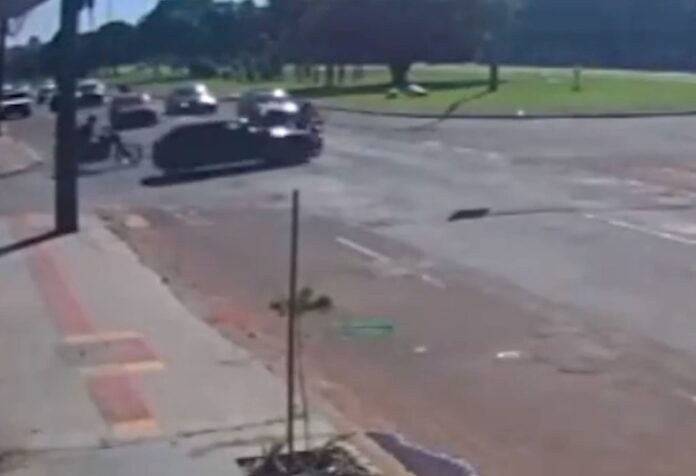 Câmeras de videomonitoramento registraram um acidente de trânsito envolvendo uma motocicleta e um veículo no cruzamento da Avenida Costa e Silva com a Águiar Pereira de Souza, nas proximidades do Terminal Morenão, em Campo Grande.