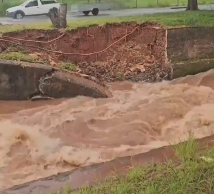 Vídeo compartilhado com a imprensa na data de hoje mostra que a terra, às margens do córrego, cedeu, levando o concreto para dentro da água e abrindo uma enorme cratera no local.