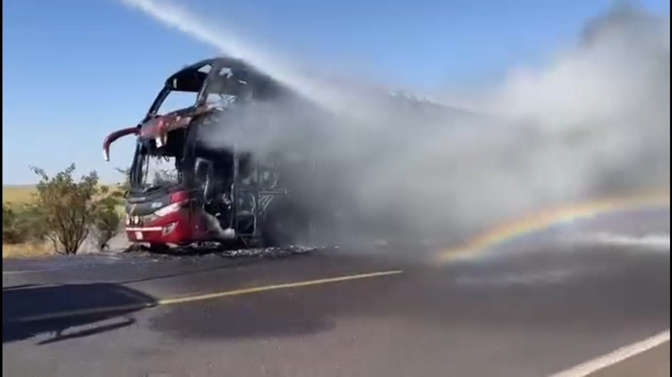 Um ônibus ficou completamente destruído na manhã dessa quinta-feira (04) ao pegar fogo na rodovia federal BR-163, na região de Nova Alvorada do Sul.