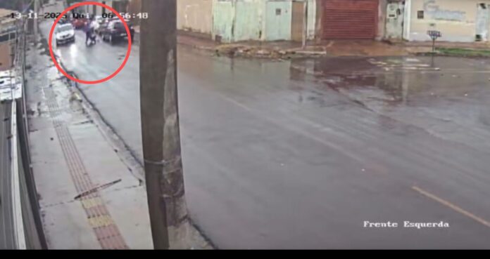 Toda a dinâmica foi registrada por uma câmera de vídeo e mostra o momento em que a moto ocupada pela vítima seguia pela Rua Guaianazes. A pista estava molhada.