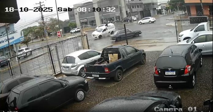 Imagens de uma câmera de videomonitoramento registraram o momento em que um motociclista colide fortemente contra uma pick-up, em Campo Grande. A batida foi tão forte que por muito pouco o carro não tombou.
