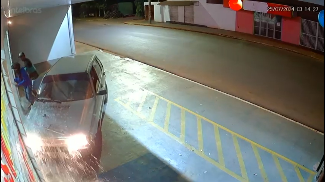 O motorista joga o carro contra a grade e a porta de vidro da loja e dá a marcha ré, momento em que dois bandidos deixam o automóvel e entram. Na sequência, o carro bate uma segunda vez contra a porta e mais um ocupante invade o interior do imóvel.