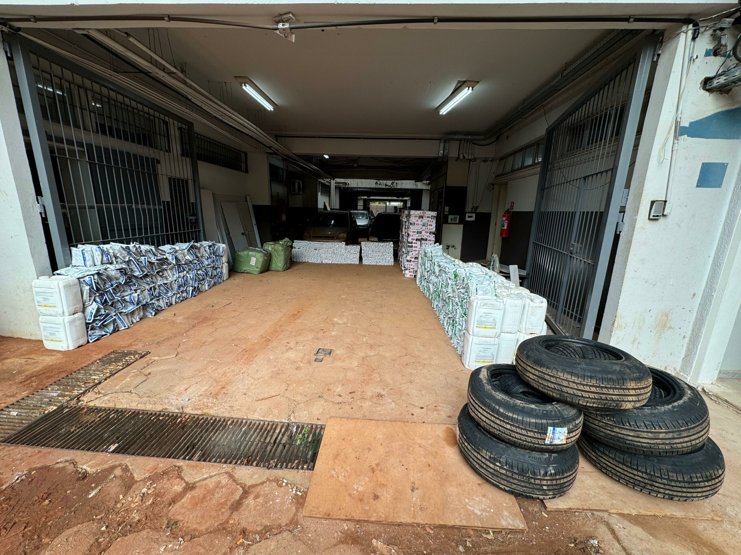 Um dos suspeitos informou que havia mais mercadorias em sua casa, no bairro Aero Rancho. No local, foram encontrados 25 pneus de origem estrangeira e aproximadamente 2.809 armações de óculos.