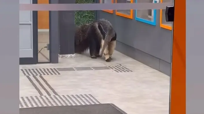 Um tamanduá-bandeira foi resgatado pela Polícia Militar Ambiental (PMA) de dentro de uma agência bancária situada no centro de Campo Grande, na sexta-feira (30). O registro foi divulgado nas redes sociais e rapidamente viralizou, retratando uma situação típica da fauna local que se mistura ao ambiente urbano.