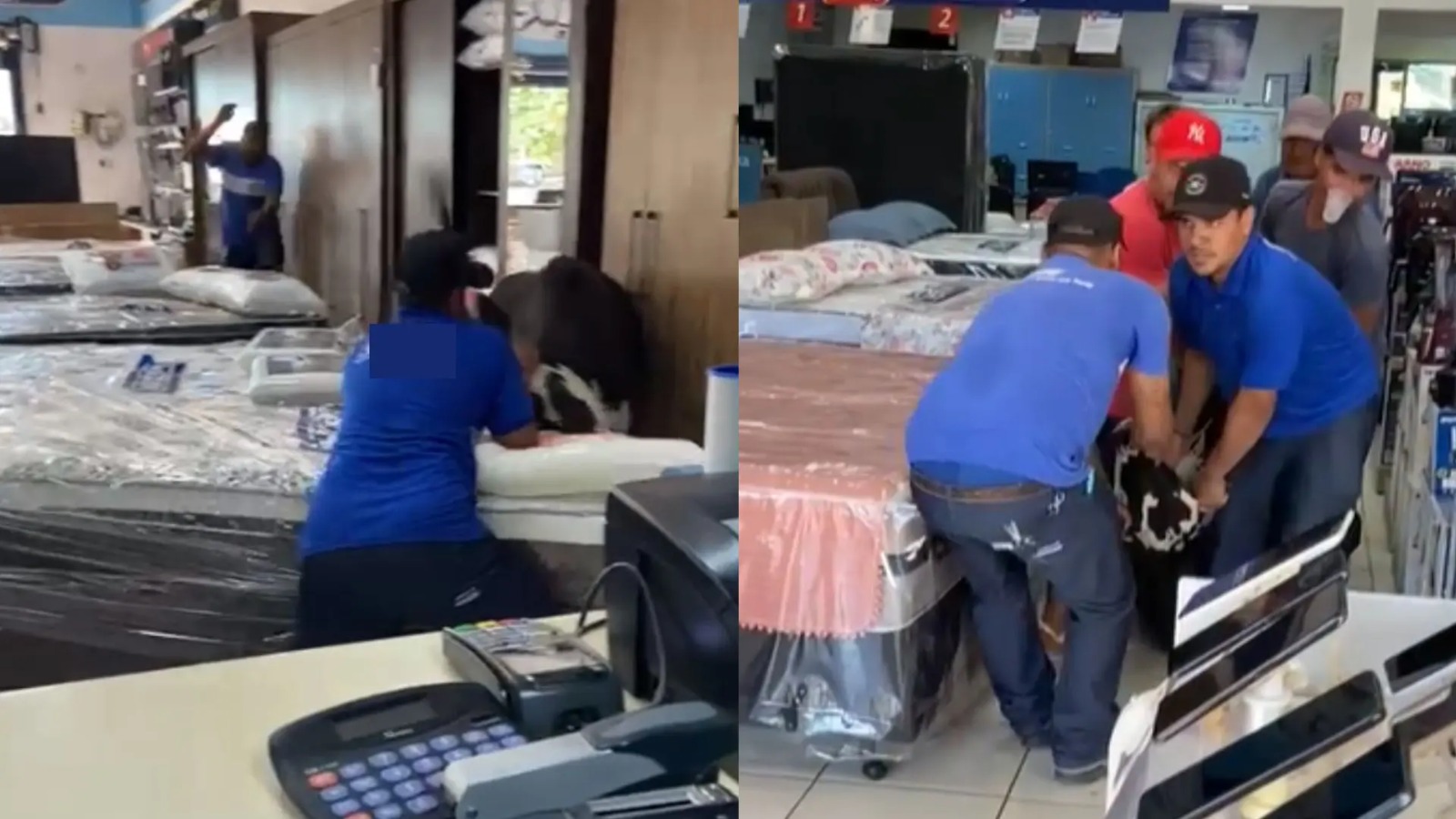 O vídeo do resgate foi compartilhado nas redes sociais e rapidamente viralizou. Pelas cenas, é possível ver que a vaca estava no meio da loja, próximo das camas e colchões à venda, quando foi imobilizada.