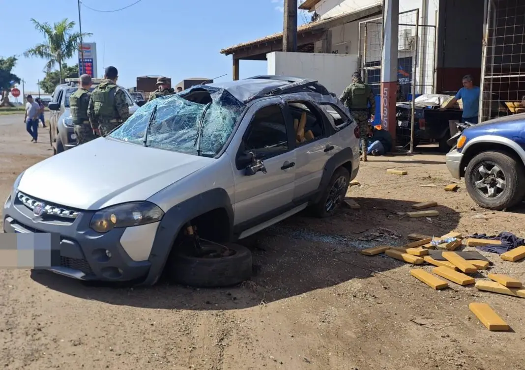 Já no perímetro urbano, o condutor perdeu o controle da direção ao passar por uma rotatória e o carro capotou, esparramando os tabletes da droga pela via.