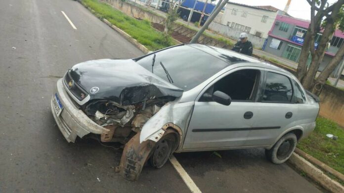Um veículo ficou bastante danificado na manhã deste sábado (08) ao atingir um poste de iluminação às margens do córrego Segredo, na Avenida Presidente Ernesto Geisel, no centro de Campo Grande.