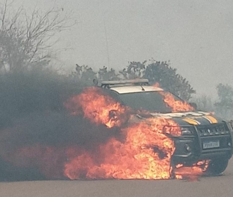 Os motorista que já tinham que redobrar os cuidados para atravessar cortina de fumaça que encobriu a rodovia, tiveram que parar de vez e ficaram espantados com a cena do veículo da PRF em chamas sendo destruído. Conforme informação que já circulavam e foi ratificada pela PRF, que foi deslocada até o local, o incêndio começou na vegetação dos dois lados da pista, tomando grandes proporções em minutos e chegou até a estrada. A rapidez foi tanta que a viatura parada no acostamento foi atingida Segundo a PRF, o incêndio na viatura começou às 13h20, no km 402.